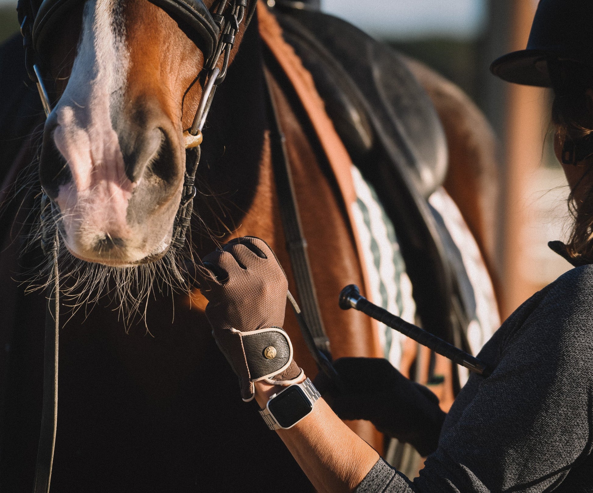 The palms are built from genuine goat leather, with reinforced suede grip patches at rein contact points. The outer layer of stretch mesh or jersey works with the natural movement of your hands, providing comfort and breathability. Secured with an easy velcro closure, finished with digital touch screen patches for your devices.