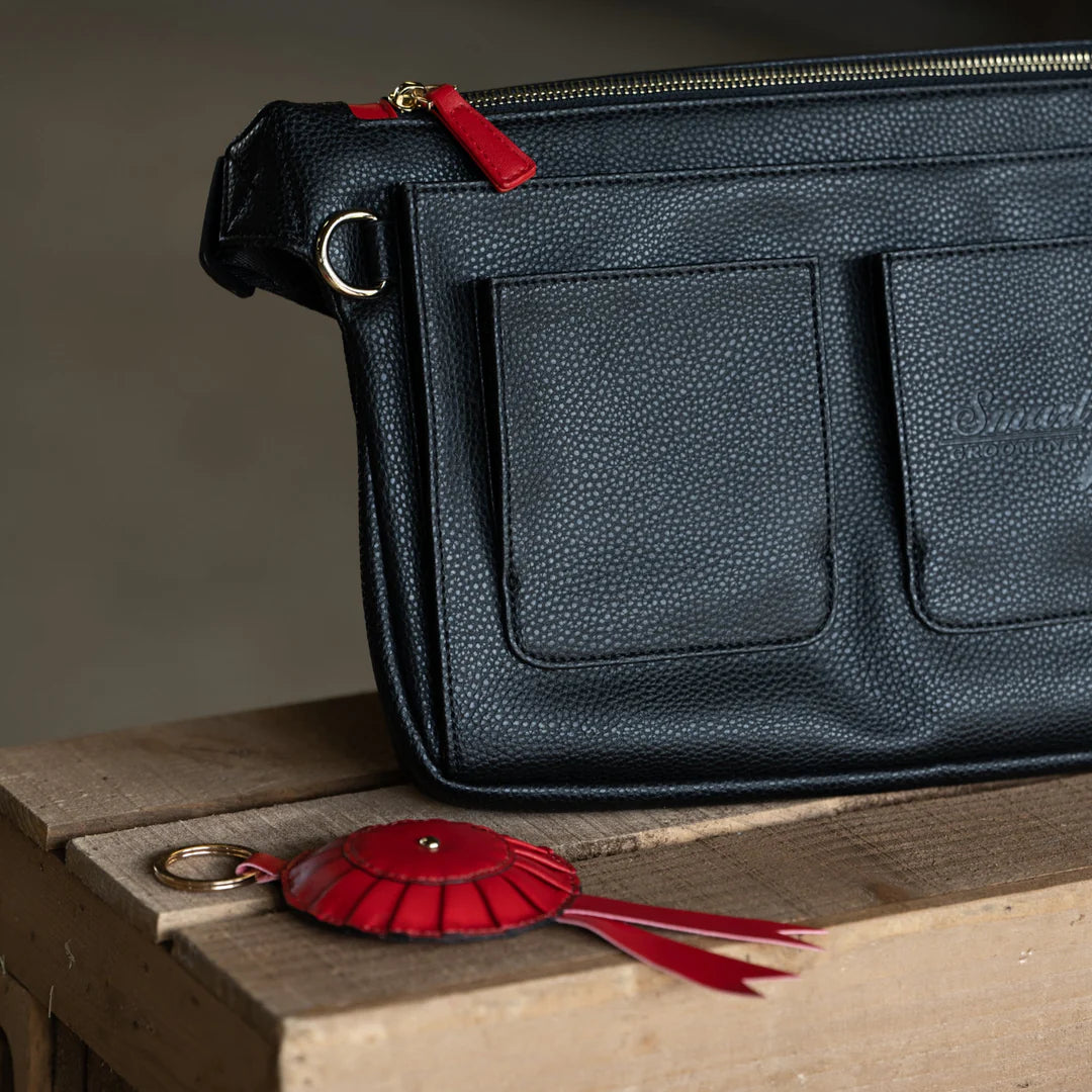 Perfect for braiders and plaiters, this charming pincushion keyring keeps your needles organized and within reach. Featuring eight pre-drilled holes for threading needles, it doubles as a practical accessory and collectible piece inspired by our signature logo. Crafted in rich red faux leather with subtle branding, it clips easily to plaiting aprons, grooming kits, or any equestrian bag. A stylish solution for anyone who takes their mane work seriously—but doesn't take themselves too seriously.