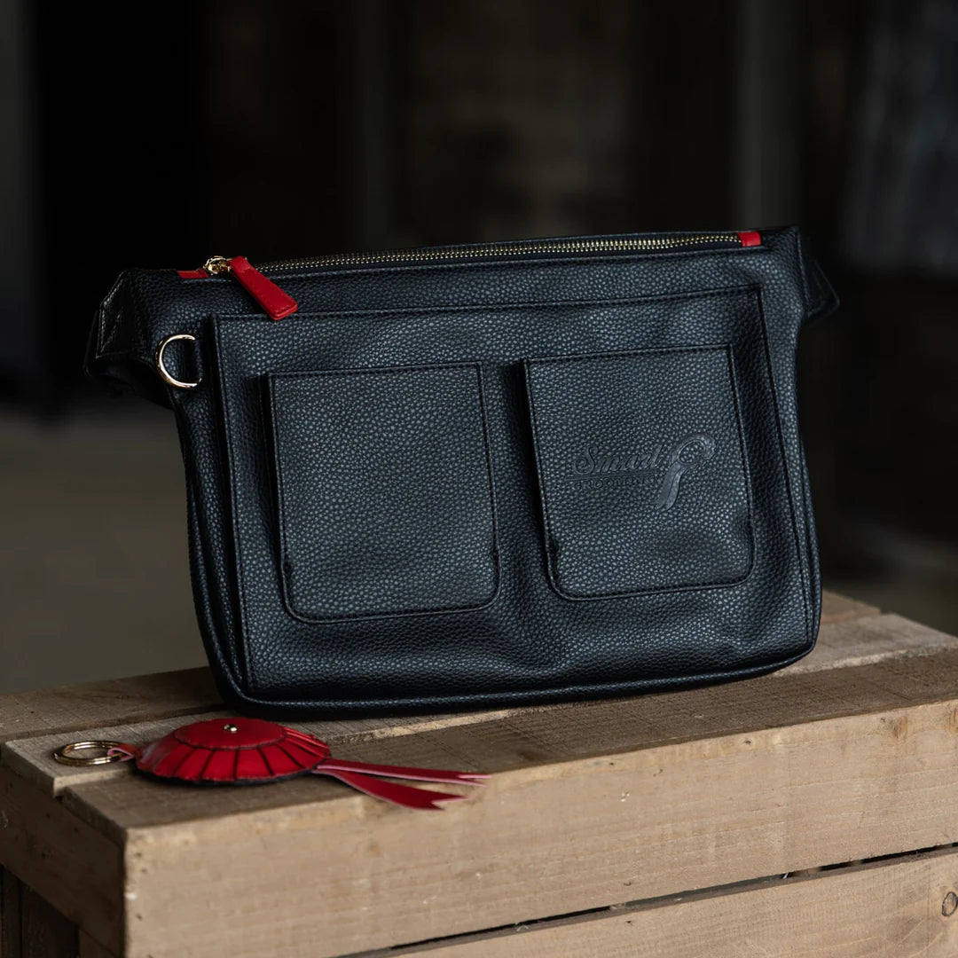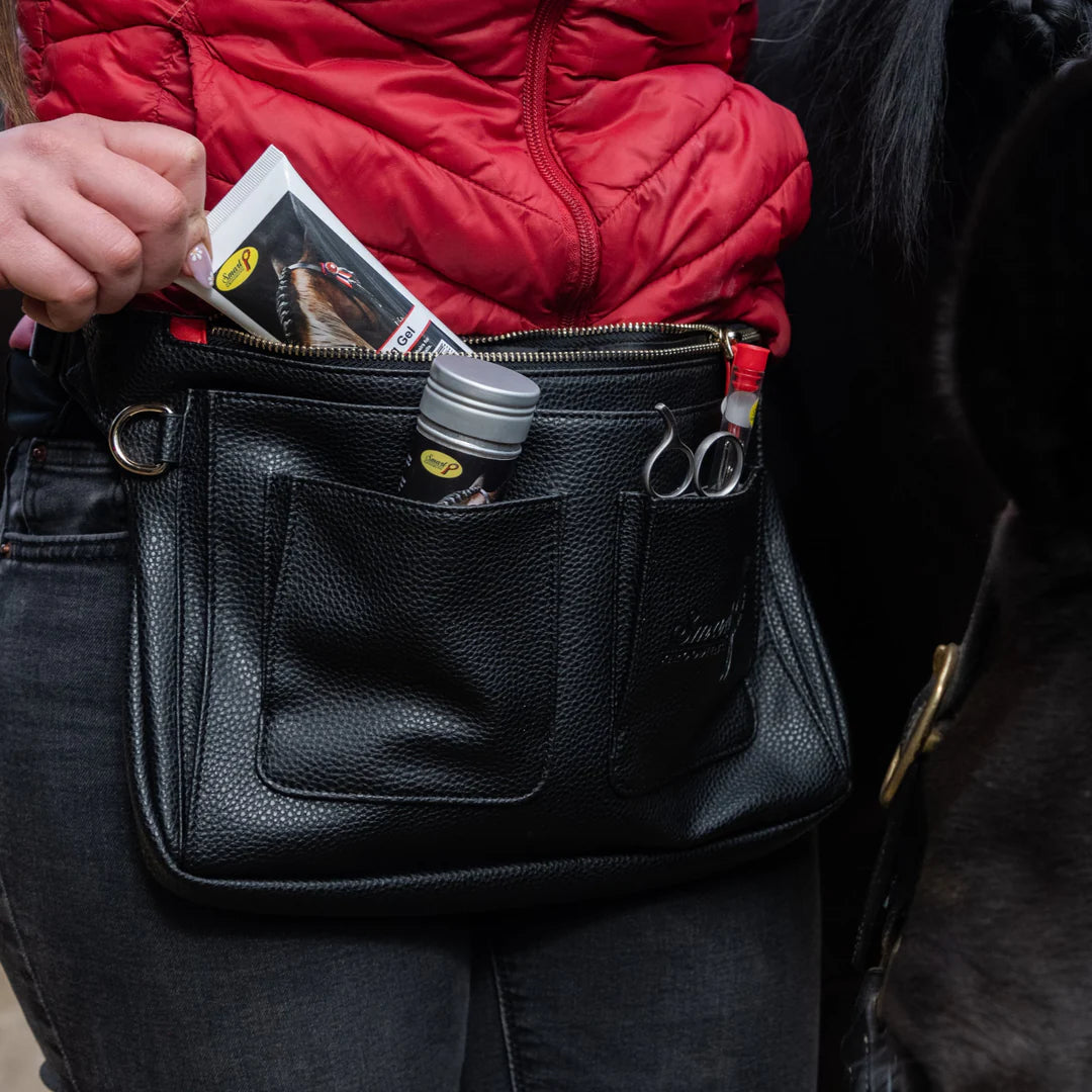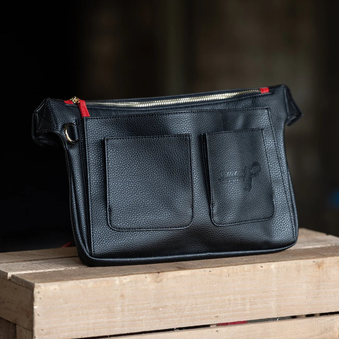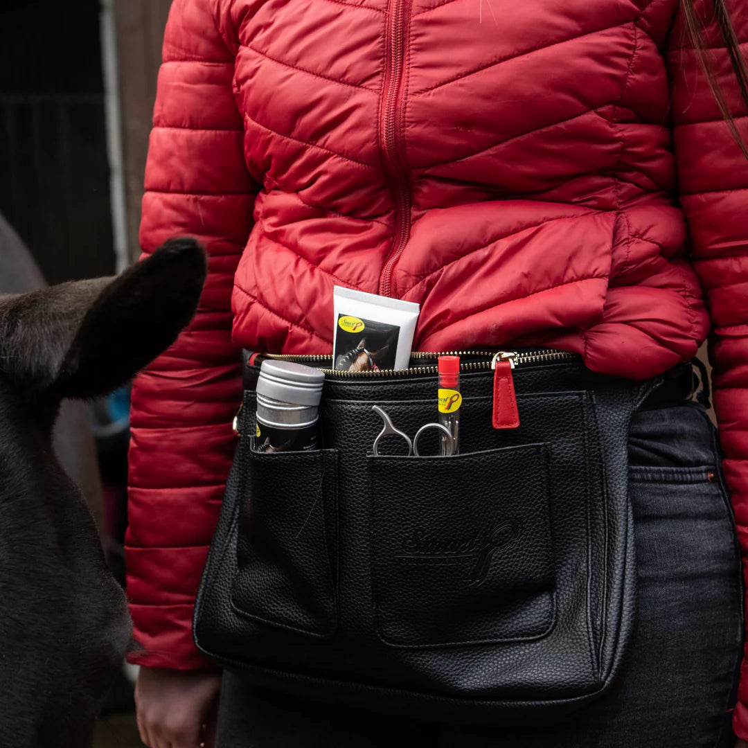Keep your plaiting kit organized and within arm's reach with this smart apron designed for serious braiders. Crafted from durable matte-grained vegan leather, it's as practical as it is polished—simply wipe clean between sessions and shows. The signature red zip tab and subtle embossed branding add a touch of understated elegance. Multiple storage solutions include a full-width zipped pocket for larger essentials like equine passports, two front pockets fitted with scissor and accessory slots, and a spacious central pocket with three internal dividers to corral your threads, waxes, and gels. Fully lined for comfort and durability, this one-size apron transforms plaiting day from chaotic to completely controlled.
